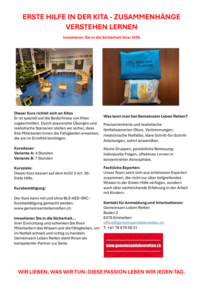Ihr Profi für professionelle Kursleitung in Ihrer Kita. Unsere Weiterbildungskurse werden von Experten durchgeführt, damit Sie und Ihr Team bestens vorbereitet sind. Ausserdem beraten wir Sie gerne, welche Ausrüstungen für Ihre Kita sinnvoll sind, um eine sichere und liebevolle Umgebung zu schaffen. Wir stehen Ihnen jederzeit beratend zur Seite und freuen uns auf Ihre Fragen.